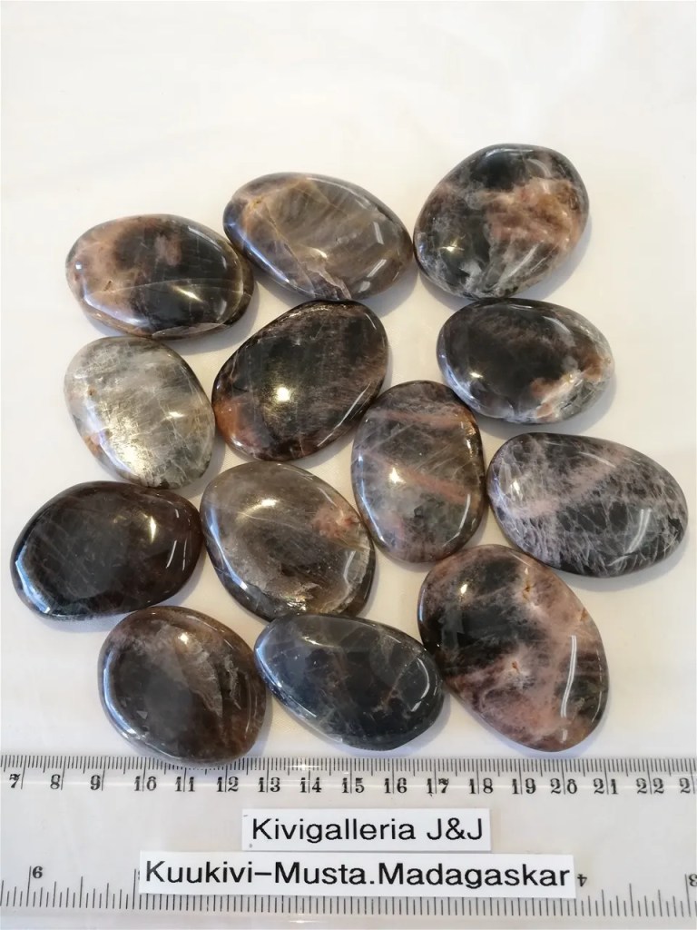 Uusi erä!!! Ihania puna/ hopeanhohtoisia mustia kuukiviä, hiottu/käsin kiillotettu ns. kämmenkiviksi. Koko n.3-3.5 x 4,5-5.5cm Ravun, Vaa’an ja Skorpionin horoskooppikivi. Chakra: Sakraalichakra. Kuukivi auttaa pääsemään yhteyteen oman sisimpänsä kanssa. Tyynnyttää, tasapainottaa ja auttaa hallitsemaan tunteita. Kuukivi on lohduttava kivi, se lisää myötätuntoa, mielenrauhaa ja viisautta, karkottaa pessimistiset ajatukset ja vähentää ylireagointia.